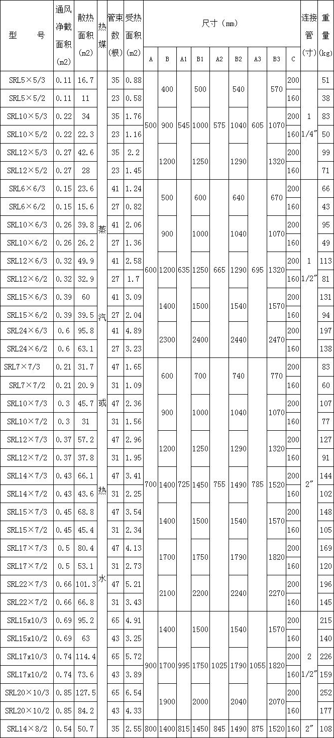 3、SRL空氣熱交換器(散熱器)是采用鋼管鋁翅片管束組成,在順氣流方向分二排、三排兩種,共有37種型號;